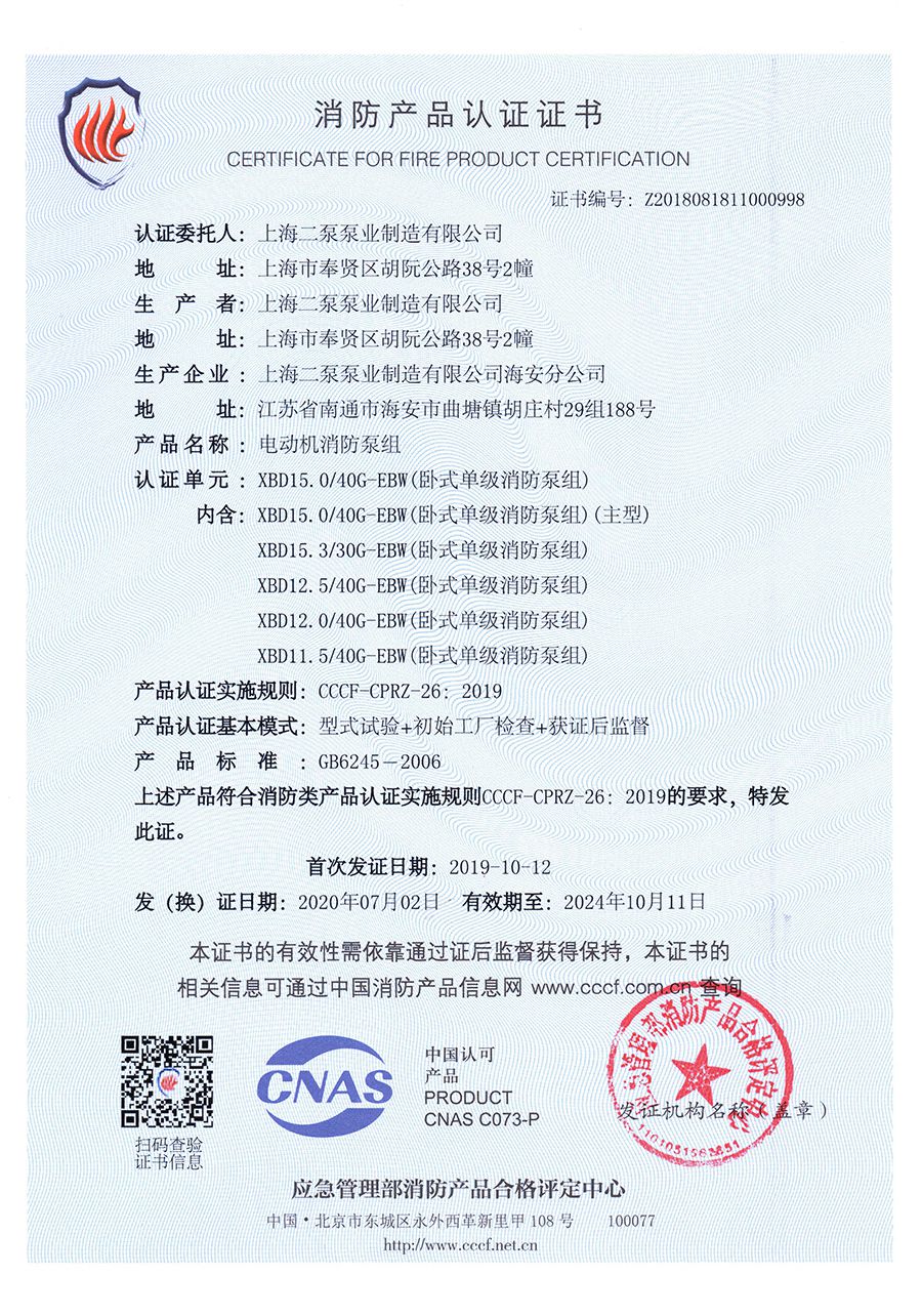 臥式單級EBW-消防產品認(rèn)證證書