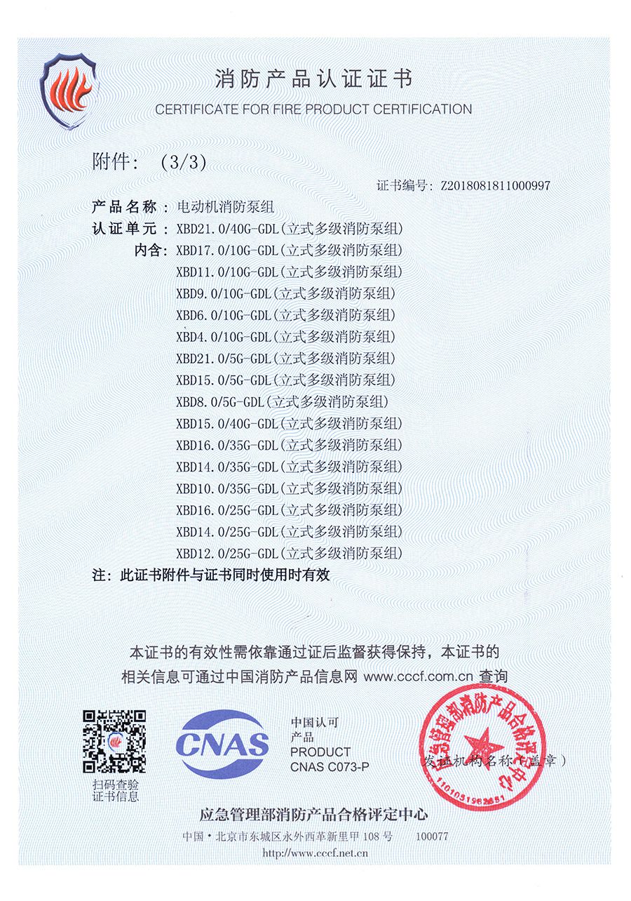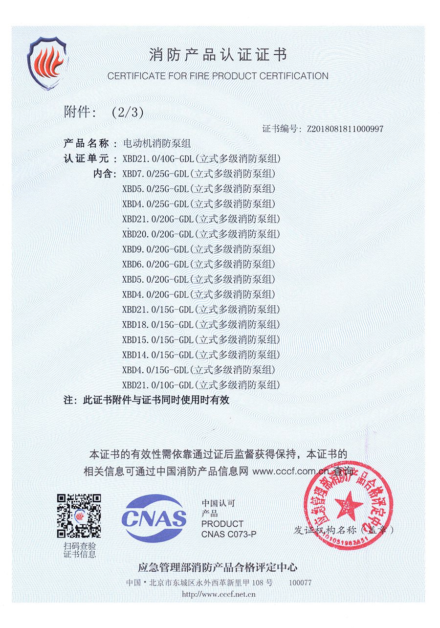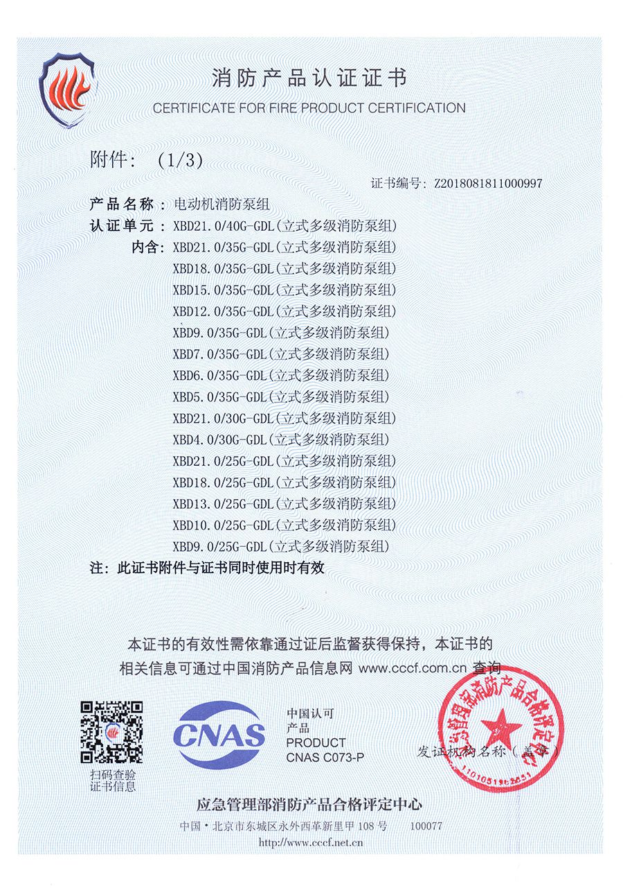 立式多(duō)級GDL-消(xiāo)防產(chǎn)品認證證書(shū)