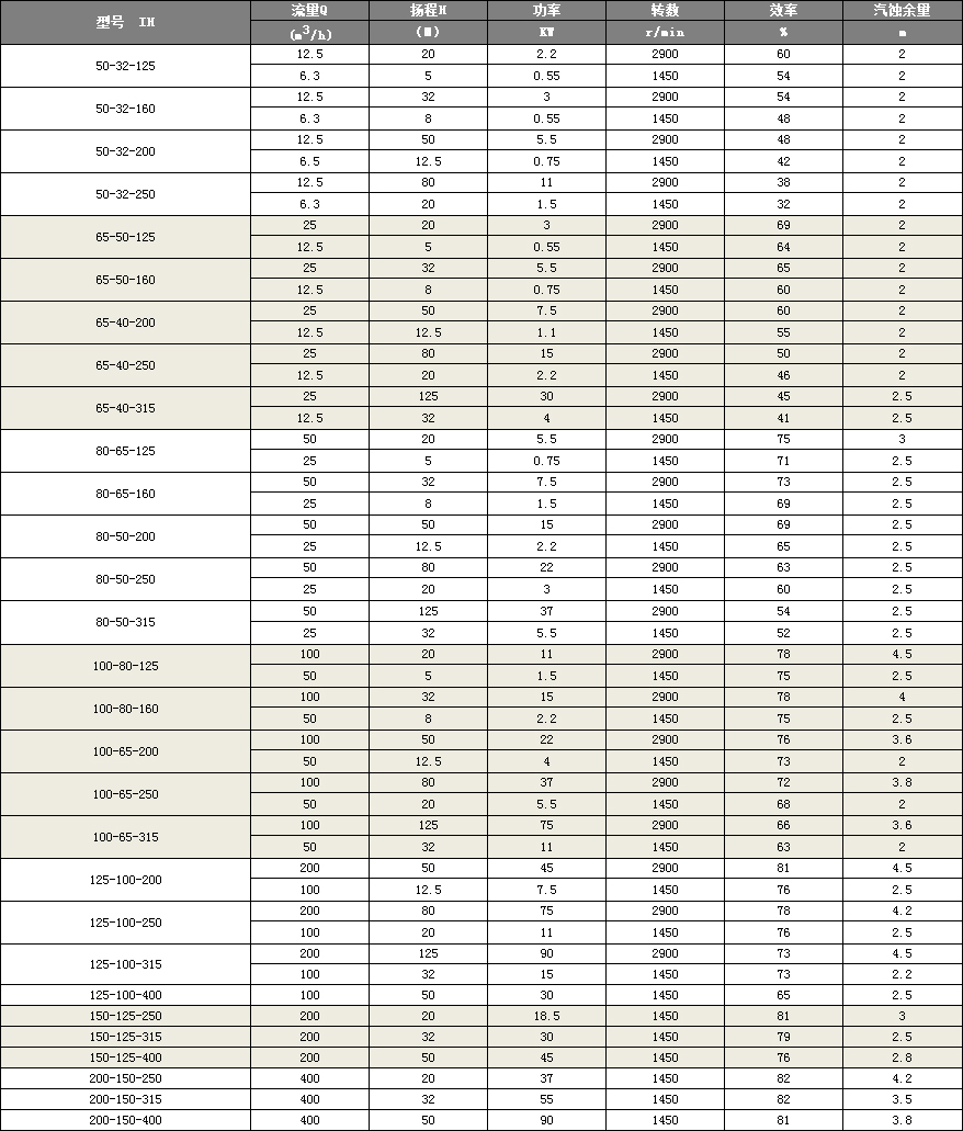 IH型係列泵有29個基本型,其中22個雙速(2900、1450r/min)經過A、B兩種型式的葉(yè)輪直徑切割變型後(hòu),達(dá)112個規格。