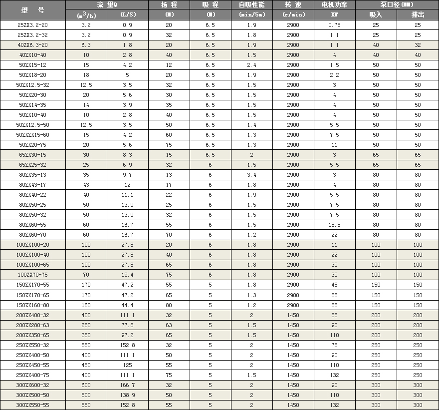 ZX型泵在工農業生產、搶險救助,如排澇(lào)、救火中作為應急泵使用效能更為突出(chū)。 ZX型泵廣泛適(shì)用石 油、化工、冶金、機械、化纖、食品、能源、交通等工業部門城(chéng)市給水、亦可用於農業(yè)排灌、噴灌。供輸送清水或粘度小(xiǎo)於(yú)5°E,溫(wēn)度低於80℃物理及化學性質類似清水的其它液體。