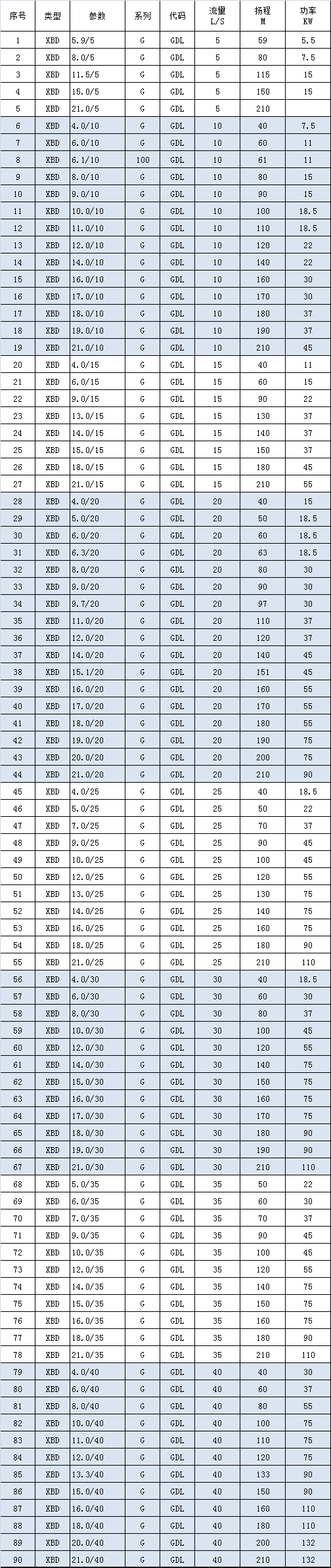 XBD-GDL係列立式管道消防泵性能範圍: